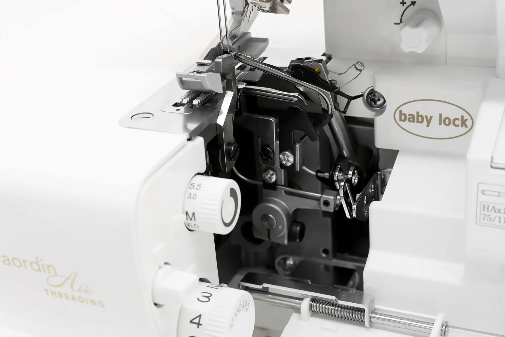 На большинстве моделей оверлоков для 2‑ниточного шва используется специальный металлический конвертер (или переключатель), который блокирует верхний петлитель. Без него машина будет работать только в 3‑ниточном режиме.